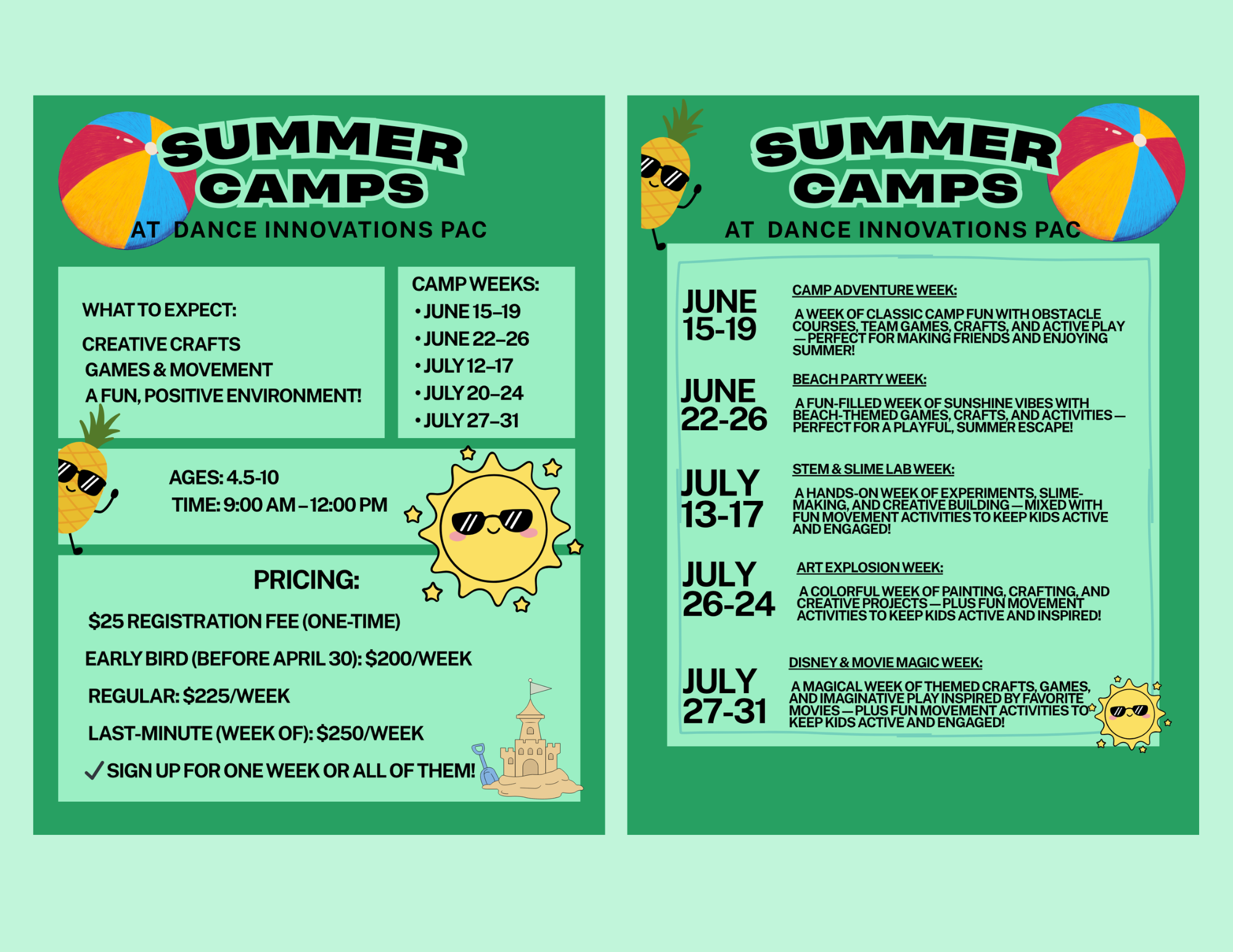 Join us for an exciting summer of fun, creativity, and movement! Our Summer Day Camps are designed to keep kids active, engaged, and having a blast in a positive and welcoming environment. Each week features a unique theme and includes a mix of games, creative crafts, hands-on activities, and movement to keep every day fresh and exciting.